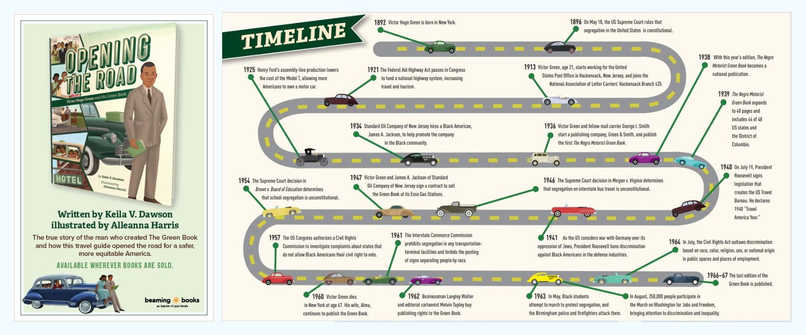 OPENING THE ROAD is the true story behind the Green Book guides Black Americans used to travel safely during legal segregation and the mail carrier who wrote it. Teachers and parents can find the Educator’s Guide here, and more free educational content to use with the book here. It’s a long, winding road toward social justice. Let’s share truths and open hearts and minds along the way. Keep going! Click here and download the illustrated timeline to print an 11×14 poster!